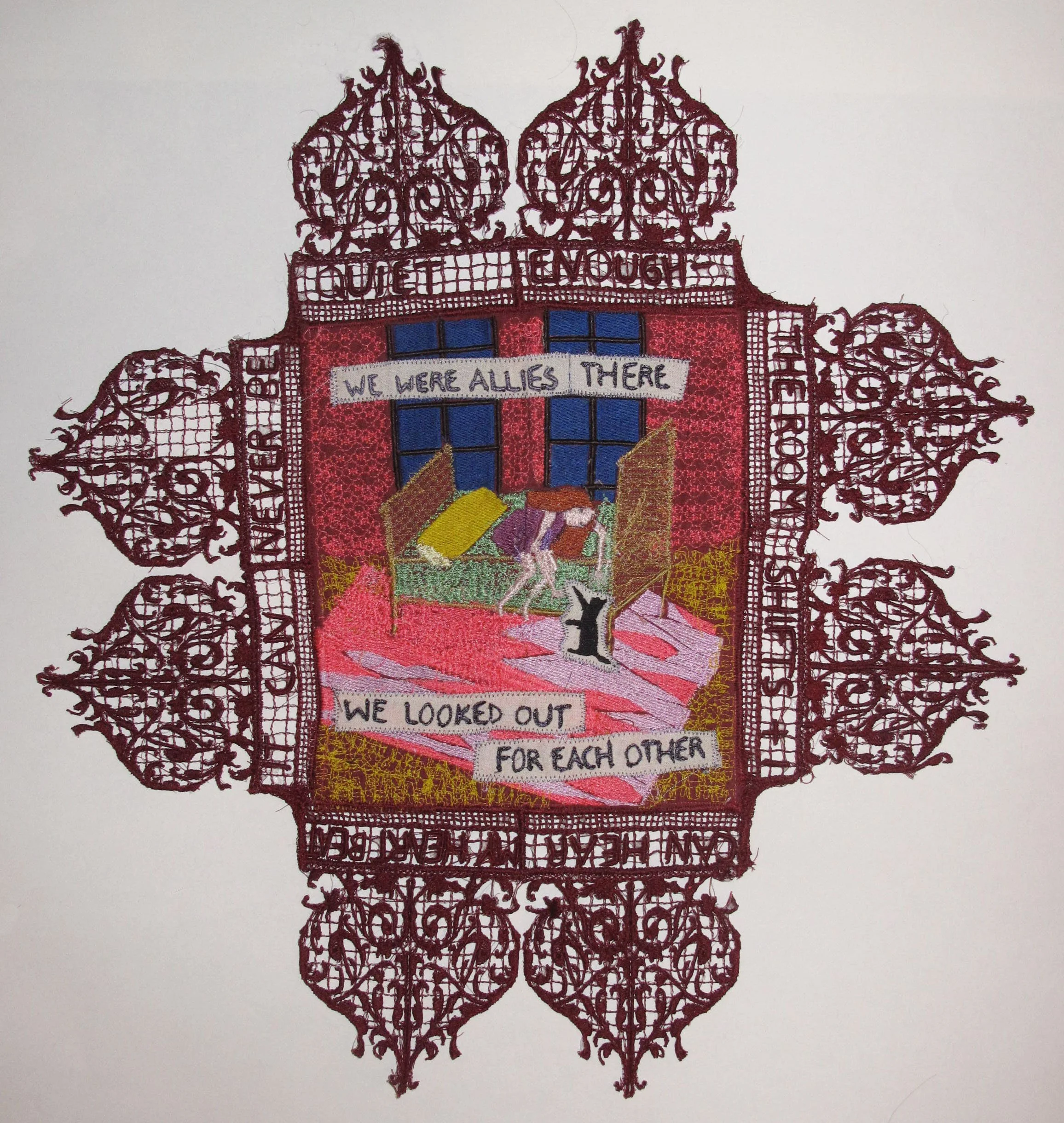 Installation shot with redwork embroidery (All it took…) on fabric, hung over hand-colored wallpaper. From the exhibition We Lit Up The Sky, 2019.