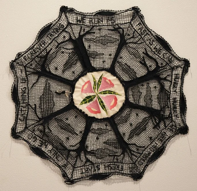 We Ran Away, 2015; digitally printed lace (aka chemical lace); 25 x 25 plus light and stand